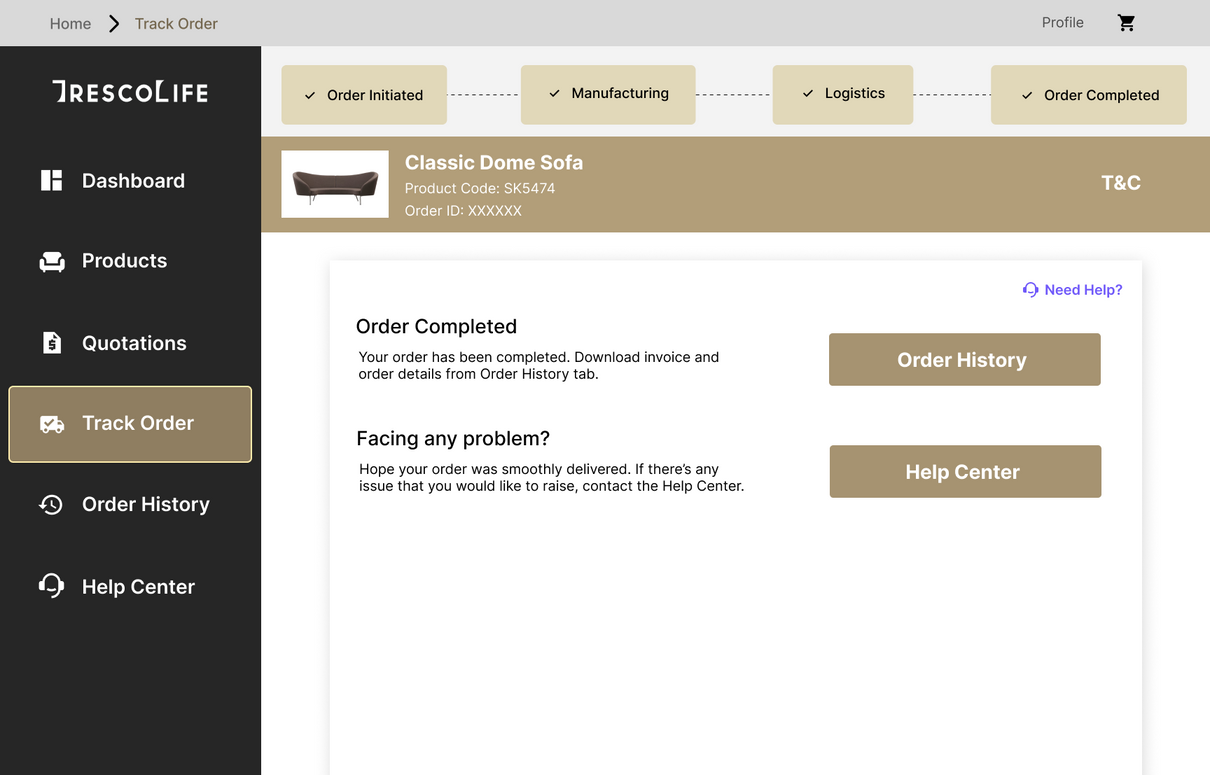 Order Completed: Get after order services like Order history and Help center for invoice and assistance respectively.